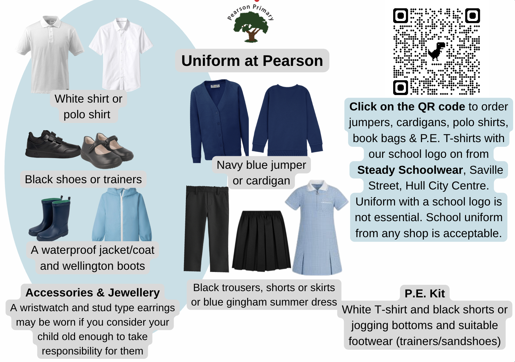 Jumpers, cardigans, polo shirts, book bags and PE t-shirts with a logo are only available to purchase from Steady Schoolwear either from their store in Savile Street, Hull City Centre or via their website https://steadyschoolwear.co.uk/